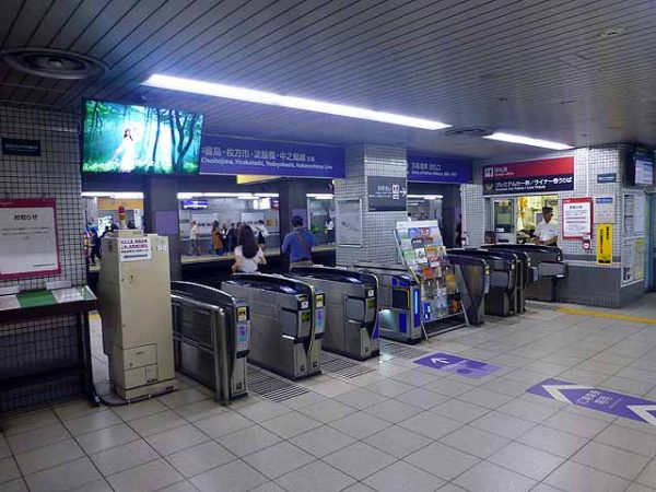 下り淀屋橋方面行きホームの改札も有人改札で、ICカード対応の自動改札機と自動券売機が設置されている。