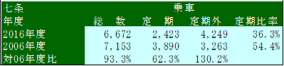 七条駅の2016年度1日あたりの乗車人員は6,672人で、うち定期利用者は2,423人となっている。定期比率は36.3%で、4割を切る数値となっており、定期外利用者が多い。10年前の2006年度と比較すると全体で6.7%減、定期利用者は37.7%減、定期外利用者は30.2%増となっている。