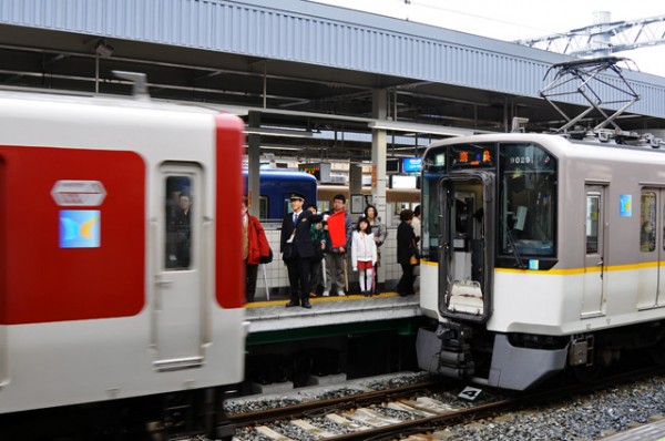 2番線に停車する普通は1番線に到着する急行からなんば線への乗り換えを橋渡しする役目も担っており、両側の扉を開けて平面移動できるようにしている。写真は野球開催時の上り臨時特急からなんば線への乗り継ぎの光景を写したもの。