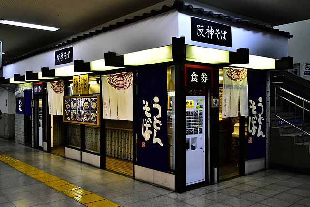 西改札付近には小規模ながら駅ナカもあり、立ち食いそばの阪神そばやパン屋などが建ち並んでいる。