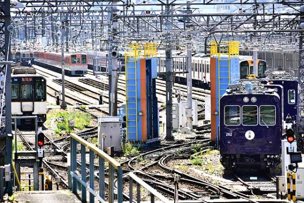 神戸方の留置線に留置されている阪神の車両に交じって工場入場のため留置されている阪急5100系。能勢電への譲渡改造では尼崎車庫に併設されている阪神車両メンテナンスが担当した。