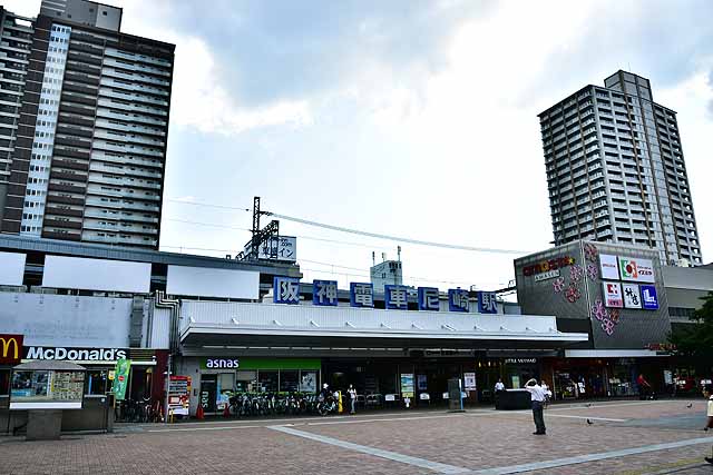 阪神尼崎駅北口。駅前は広大な広場が整備されている。駅周辺には高層住宅が建ち並び駅周辺は以前のような雑多な風景と近代的な風景が同居している。駅前広場はかなり広く、2003年の阪神タイガースリーグ優勝の際にはパブリックビューイングも行われた。