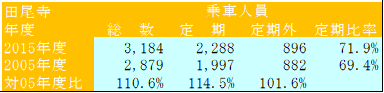 田尾寺駅の2015年度1日あたりの乗車人員は3,184人で、10年前の2005年度より10.6%増加している。定期利用者の伸びが大きく14.5%も伸びている。周辺の宅地開発が活発で利用者を増やしているが、付近は道路整備が進んでおり、三宮など神戸の中心部へは車が便利な環境にあり、今後の伸びに関しては楽観できない状況である。