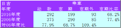 日吉駅の2016年度1日あたりの乗車人員は292人で、うち定期利用者は199人となっている。定期比率は68.2%で、7割近くが定期利用者となっている。10年前の2006年度と比較すると全体で22.1%減、定期利用者が31.3%減、定期外利用者は9.4%増となっている。