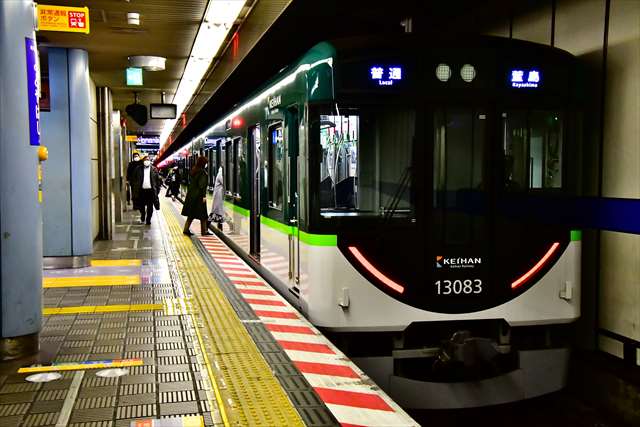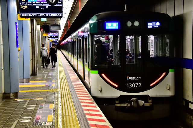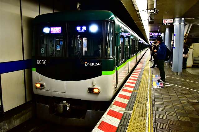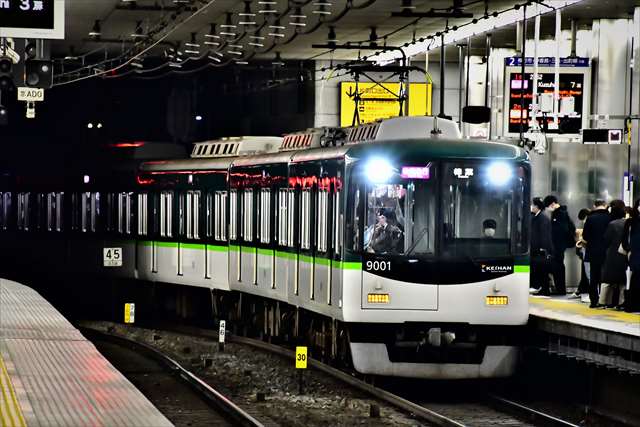 淀屋橋発22時台には特急4本、快速急行1本、準急4本が運転されている。特急は概ね15分毎の運転だが、22時30分発の次は22時51分となっており、ここは21分間隔が開く。淀屋橋発22時51分の特急はダイヤ変更により樟葉行きから出町柳行きに変更された。この電車は8000系で運転されており、プレミアムカーを連結する特急の最終となっている。快速急行は淀屋橋発22時45分1本のみの運転で、樟葉まで運転されている。準急は概ね15分毎の運転で、22時05分、22時19分、22時33分、22時58分の4本が運転されており、特急と同じく22時33分から22時58分まで25分間隔が開く。間隔が開いたところに快速急行が運転される形になっており、快速急行は特急と準急を補完する列車になっている。