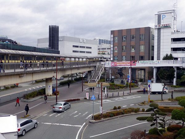 駅舎は先述したとおり、北側ではデッキでショッピングビルや阪急川西能勢口駅とつながっている。