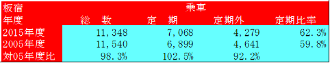 2015年度1日あたりの乗車人員は11,348人で、うち定期利用者は7,068人となっている。定期比率は62.3%で、昨今の傾向からすると定期比率は高い方である。10年前の2005年度と比べると乗車人員全体で1.7%減、定期利用者は2.5%増となっている。定期外利用者は10%近く減少しており、定期外利用の減少が目立つ。