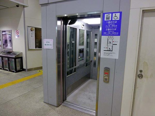 地上にある改札からホームへはエレベータが設置されておりバリアフリーに対応している。