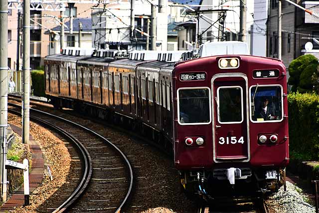 阪急今津線は兵庫県西宮市の今津と同県宝塚市の宝塚を結ぶ9.3kmの路線である。かつては西宮北口にダイヤモンドクロスがあり、神戸本線と平面交差していた。これを通って今津~宝塚間を直通していたが、神戸本線のホーム延伸など西宮北口駅改良によりダイヤモンドクロスは廃止された。これにより今津線は南北に分断されて、現在も分断した状態が続いている。このため、運転系統は今津~西宮北口間、西宮北口~宝塚間の2系統に分かれている。前者を通称今津南線、後者を通称今津北線と呼んでおり、現在のところ全く性格が異なる路線となっている。今津北線は2008年に発売された有川浩氏の小説阪急電車の舞台になった。同小説は2011年に映画化され、スクリーンでは本物の阪急電車の中、物語が展開された。