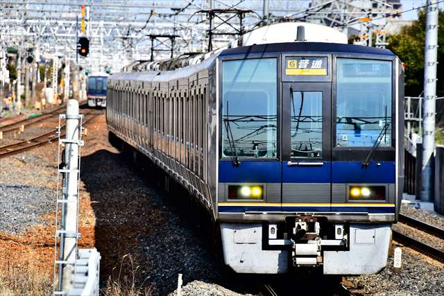 新快速と快速が毎時4本ずつの運転で、これに普通が毎時8本運転されている。新快速、快速は全て大阪まで先着となり、普通も毎時4本は大阪まで先着となる。大阪までの先着列車は毎時12本となり、利便性はかなり高い。京都方面へは新快速と快速の運転のみで、京都までは新快速が先着となる。