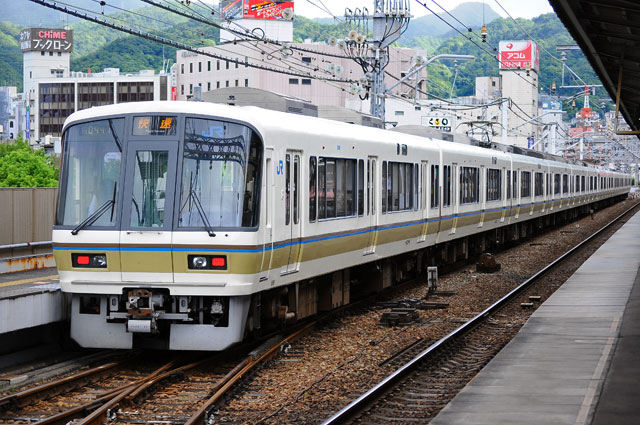JR神戸線では平日朝ラッシュ時に上り快速が西明石~兵庫間で列車線、兵庫~大阪間で外側線を走行する。JR京都線でも同様に朝ラッシュ時の快速は外側線を走行するが、JR神戸線の場合、兵庫以西が線路別複々線となっており、電車線にしかホームがない舞子、垂水、須磨の3駅は列車線走行の快速は通過するという例外が生じている。西明石発7時11分の快速が列車線走行となっており、以降西明石発8時19分の快速までの9本が列車線を走行している。