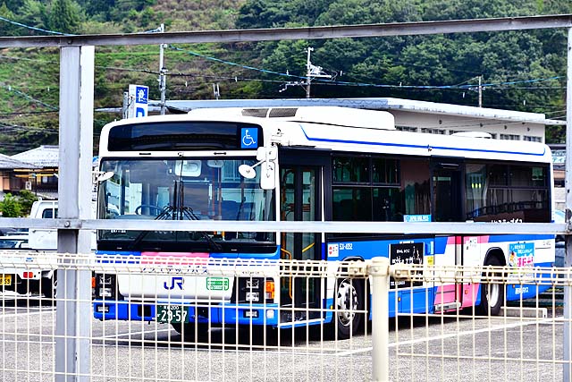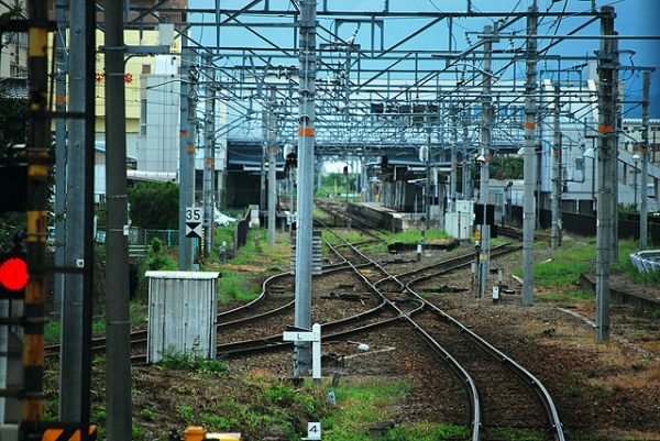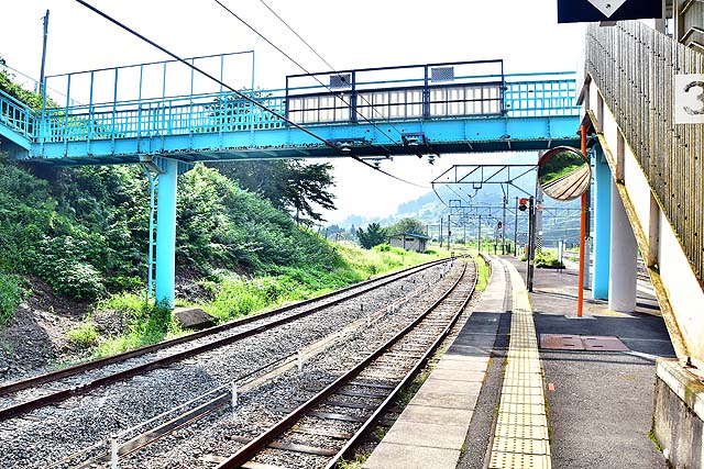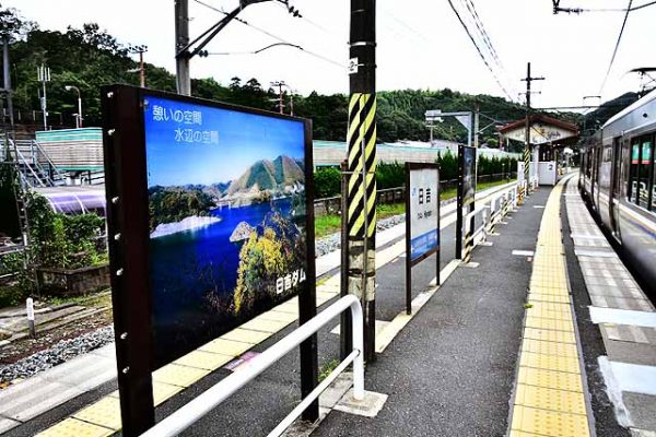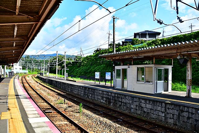 京丹波町に入り、グリーンハイツや中央テクノパークが見えて高屋川を渡り、国道27号線と交差して右にカーブして下山に着く。2面2線で線形は悪いものの1線スルーにはなっている。この辺りから高屋川や国道27号線に沿って北上して行くが、森の中を走るためその姿はほとんど確認できない。しばらく高屋川、国道27号線と並行して北上し、トンネルを3本抜けて高屋川から分かれた由良川と並行し、同川を渡って2面2線の和知に着く。和知は由良川と山に挟まれた狭隘な地にあるが、園部以遠ではそこそこまとまった乗降があるので、朝夕の一部の特急も停車する。和知を出ると再び由良川を渡り、大きく左にカーブして進路を西に向けて国道27号線と並行して走って2面2線の安栖里となる。このあたりは山間部の山村といった風情のところで利用者は非常に少ない。深い森の中を走って行き、その森の合間に2面2線の立木がある。由良川、国道27号線とずっと並行して進み、京丹波町と綾部市との境に立木がある。同駅からはしばらく北上する。短いトンネルを抜けて綾部市に入り由良川沿いに北上していき、左にカーブして1面2線の山家となる。同駅からもさらに由良川に沿って西向きに走り、右にカーブして前方に綾部の市街地が見えてきて、左にカーブして由良川と離れて、舞鶴線が右手から近づいてくると綾部となる。綾部は2面3線で舞鶴線が発着しており、2003年10月改正から同駅で特急列車は舞鶴方面と福知山方面行が分割併合している。