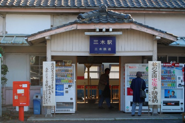 起点の厄神はJR加古川線との連絡駅で、加古川線厄神駅を間借りしたような形になっている。このあたりは北条鉄道の粟生と似ている。国鉄時代は加古川線の支線で直通運転も行っていたので当然ともいえる。三木鉄道は3番線からの発着となっており加古川線2番線とはホーム上での乗換えが可能になっている。加古川線厄神には車両基地が加古川から移設されており、将来は電化されて電車区の派出所になるものと思われる。厄神を出ると三木鉄道は直進し、JR加古川線はしばらく並行して走ってから加古川を渡るため左にカーブしていく。三木鉄道はしばらく加古川に沿って走り、国包、宗佐と駅間距離が短いところをほぼ直線で走る。宗佐を出ると三木市に入り、すぐに下石野となる。三木鉄道は駅間距離がかなり短い。ほとんどの駅間が500m強の距離になっている。さらに600m進んで石野となり、次の西這田までは駅間1.7kmで三木鉄道最長の駅間距離となっている。三木鉄道は線路状態はよくないが、線路は直線が多い。沿線人口は少ないが、線路改良を行って加古川線との直通運転を行えば“復活”というより“おお化け”もありうるのではないだろうか。西這田から1km走って別所、さらに700m走って高木となる。そして高木から600m走って終点の三木となる。三木はホーム1面2線で2番線は使用されていない。また2番線の北側には貨物ホームらしき跡が残っており、自転車置き場になっている。駅の先には車庫がある。加古川を渡った対岸には神鉄三木駅があるが、結構離れており歩いていくには少々辛い。
