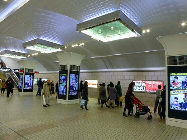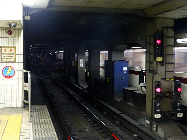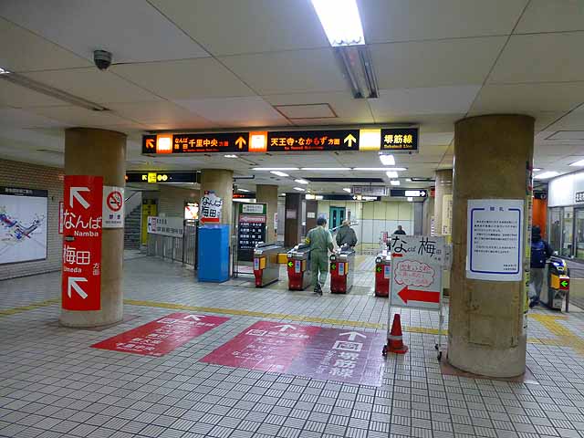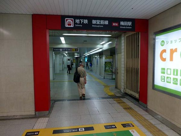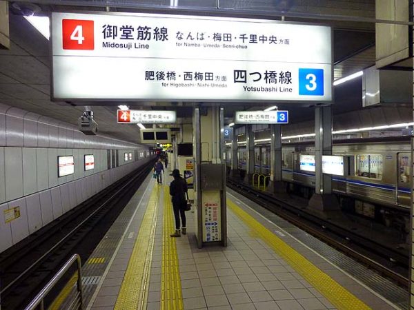 中津を出ると地上で阪急が交差して国道176号線の下に入り、JR大阪駅との交点付近に梅田がある。梅田は1面2線ながらホームが大幅に拡張されており、上下線の間に仕切りの壁があるほど広いホームになっている。これは梅田駅の混雑が激しいため、開業時に準備されていた複々線用の用地を活用してホームを拡張した結果である。御堂筋線梅田駅は単独駅の乗降者数としては地下鉄では日本一を誇っている。なんばや天王寺なども上位にランクされており、大阪の中心部を貫く路線に相応しいデータが弾き出されている。梅田では谷町線の東梅田、四つ橋線の西梅田と連絡しており、連絡切符も発売されている。また、JR大阪駅、阪神梅田駅、阪急梅田駅とも連絡しており、大阪キタの巨大ターミナルの中心にあるといっても過言ではない。阪急との乗り換えは、江坂寄りの車両、谷町線、四つ橋線、阪神との乗り換えは中百舌鳥寄りの車両に乗った方がよい。JRとの乗り換えはどちら側でもできるが、中改札からの乗り換えが一番近い。中改札付近にあるエスカレータは大阪駅への隘路となっており、ラッシュ時にはボトルネックとなり大変混み合う。このあたりは改良が必要である。
