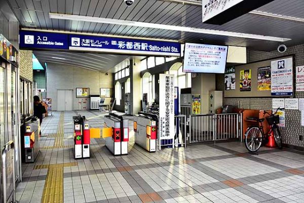 途中箕面市の粟生間地区の住宅地付近を通るが、このあたりも一駅欲しいところだ。さらに勾配を駆け上がり茨木市に入って終点の彩都西に着く。彩都西も他駅同様1面2線で、北側に引き上げ線があり、これが将来東センターまでの延伸が開業すれば本線となる。電車は1番線に到着し、一旦引き上げて2番線に入線して万博記念公園、千里中央方面へ出発する。1番線は現在降車専用ホームとなっている。駅前にはガーデンモール彩都というショッピングセンターがある以外はマンションや住宅地ばかりといった感じで、まだまだこれからの街というイメージがある。駅の西側に大阪外語大学のキャンパスがあるが、彩都西駅から直接同大学へ至る道がないので、通学に利用するのは少々不便だ。東側に広がる住宅地の向こう側には茨木国際ゴルフ倶楽部のゴルフ場が広がる。彩都西以遠の開発はまだまだで、東センターへの延伸計画が実施できるかどうかは彩都の開発の進展次第といったところだろう。